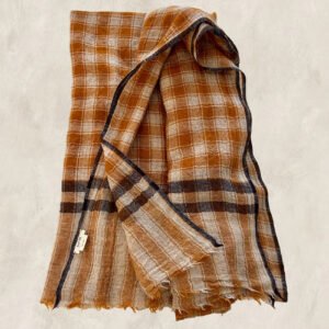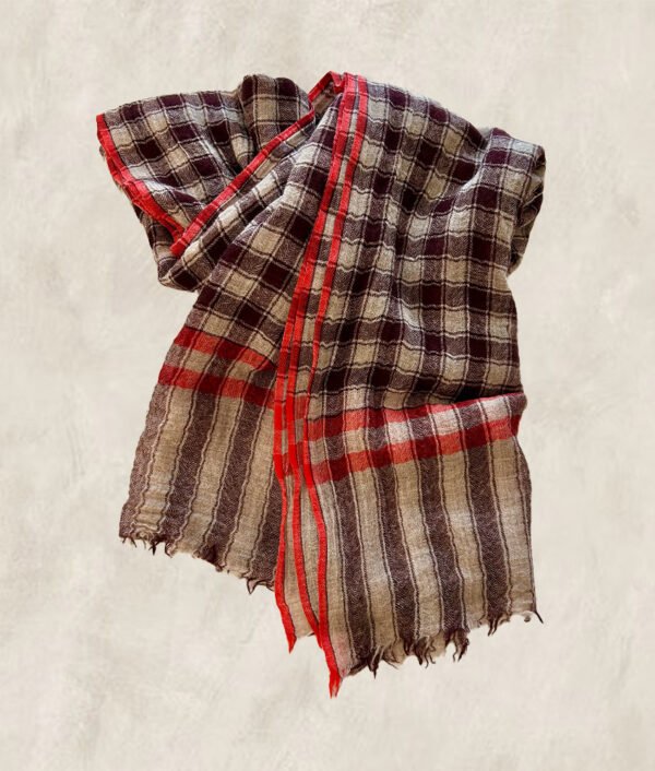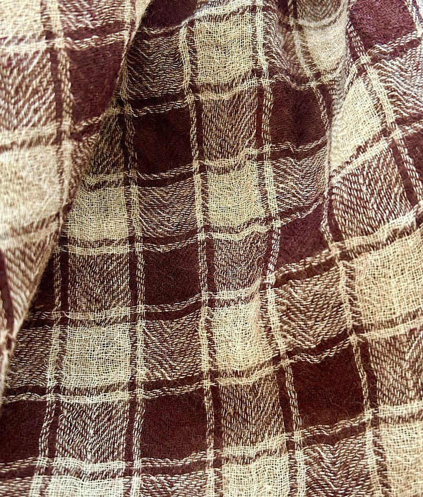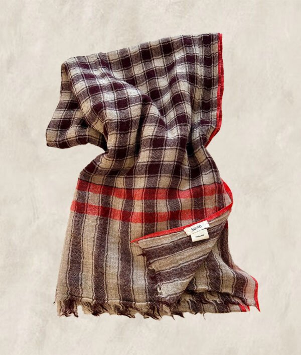 The base of the checks is natural beige, mixed with a plum, coral red on selvedges.