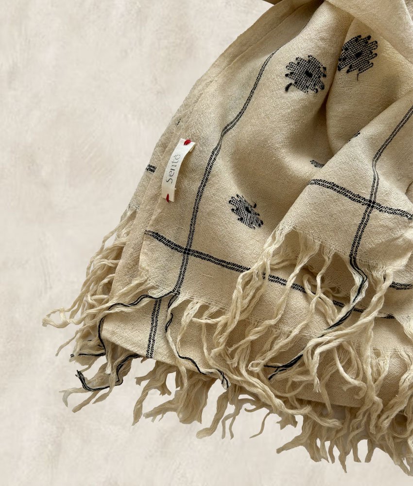 Grande étole en laine très douce tissée selon la technique traditionnelle du Jamdani.