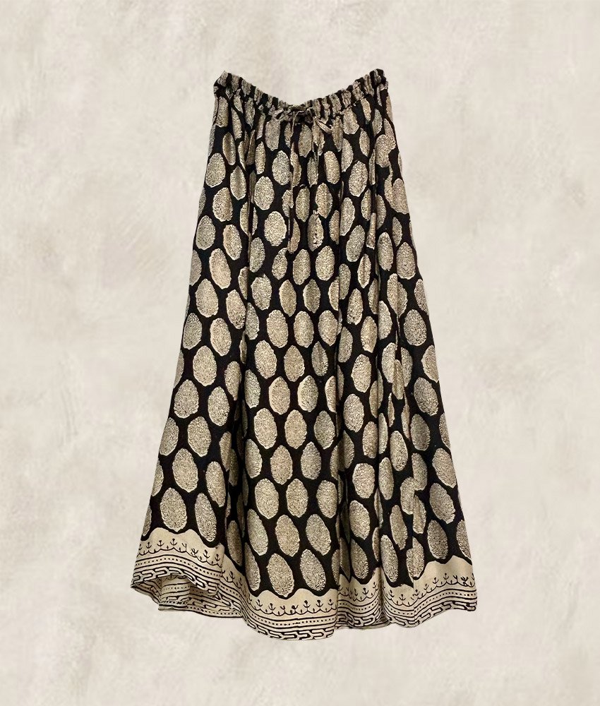 La jupe a une taille plate devant et est montée sur élastique au dos.