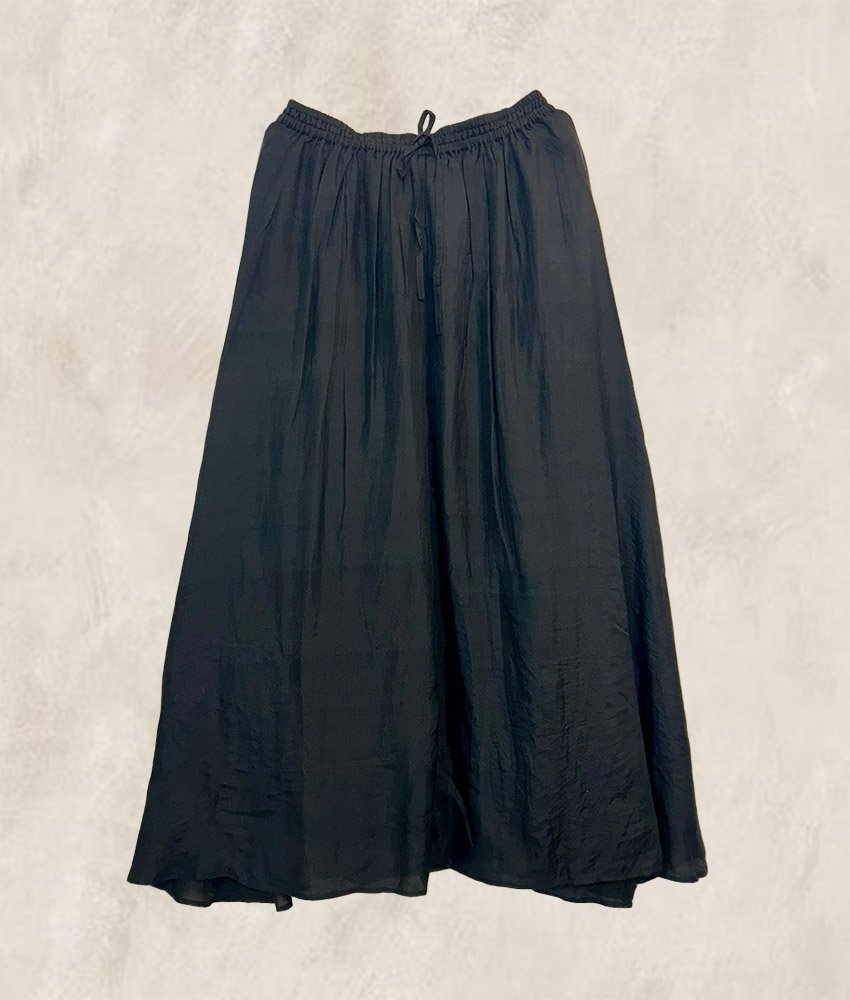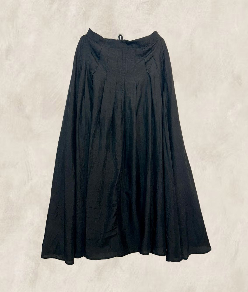 A wide and long skirt in hand woven silk.Open pleats at from side with a flat waist band.