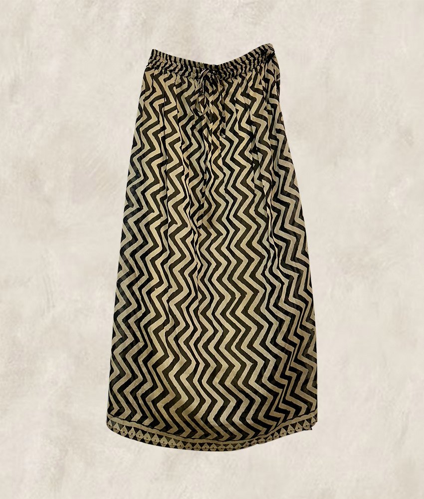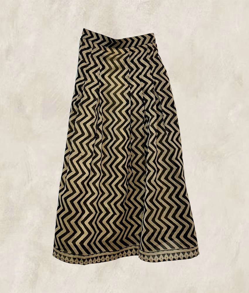 La jupe a une taille plate devant et est montée sur élastique au dos.