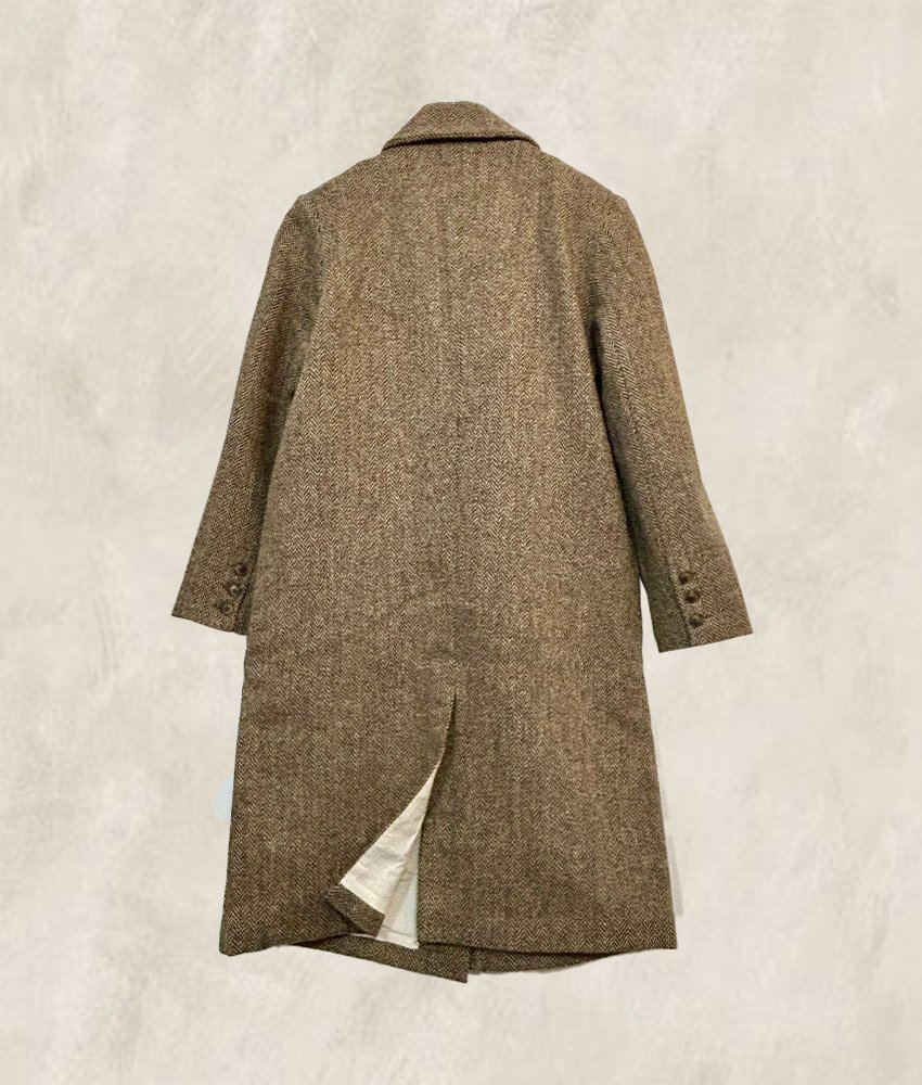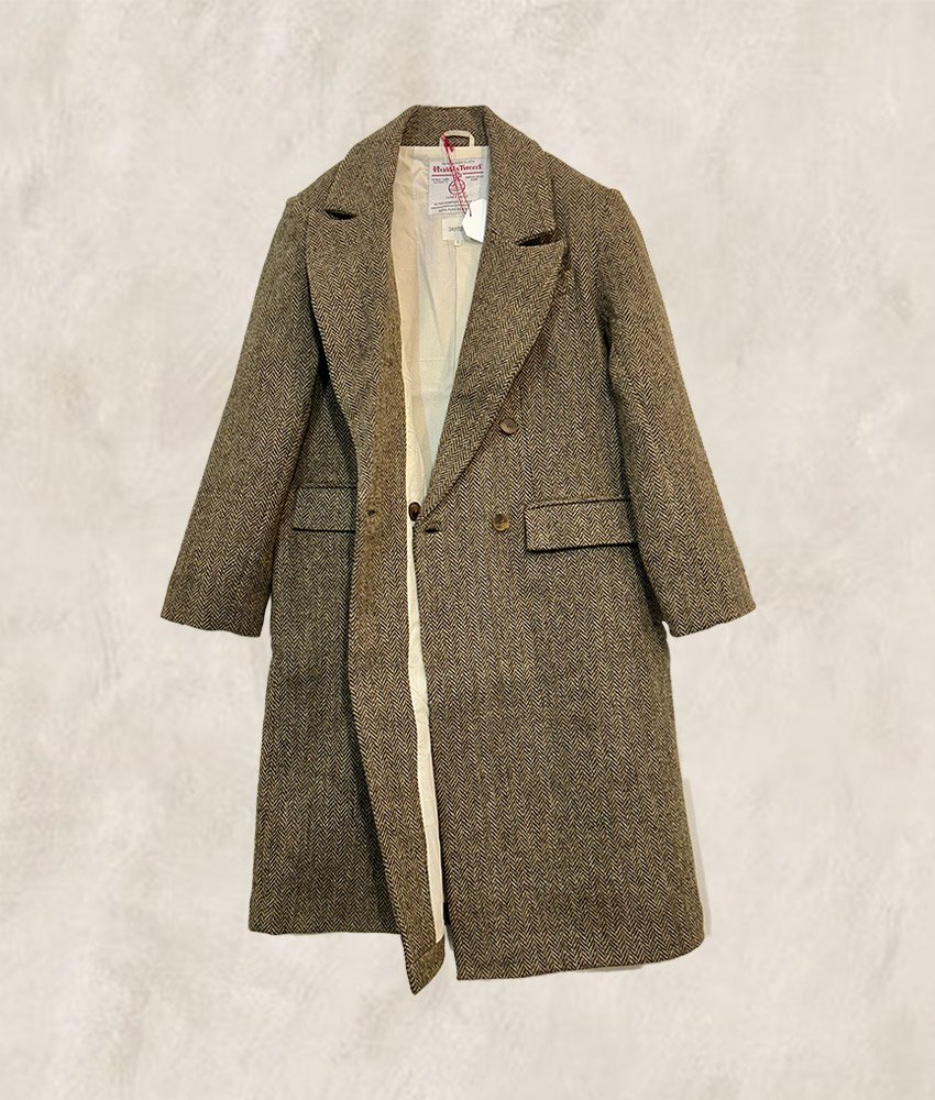 This long coat, double breasted with a masculin look is made in authentic HARRIS TWEED.