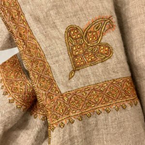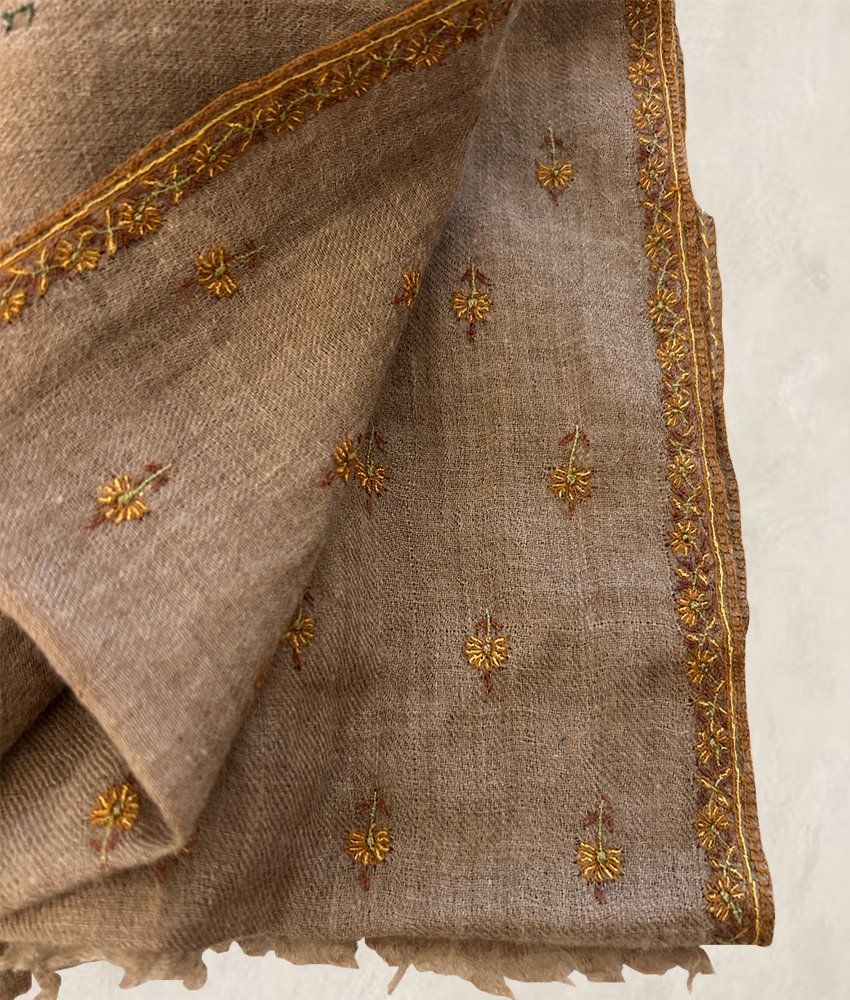 Un superbe Pashmina en cachemire de couleur naturelle, tissé et brodé entièrement à la main dans la vallée du Kashmir, à Srinagar.