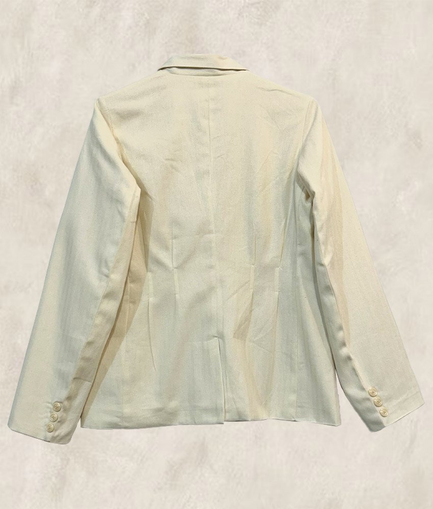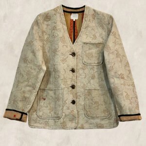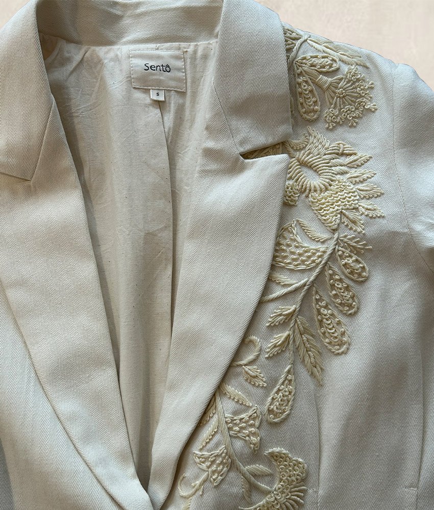 Jacket in cotton, herringbone weave, hand embroidered tone on tone at chest.
